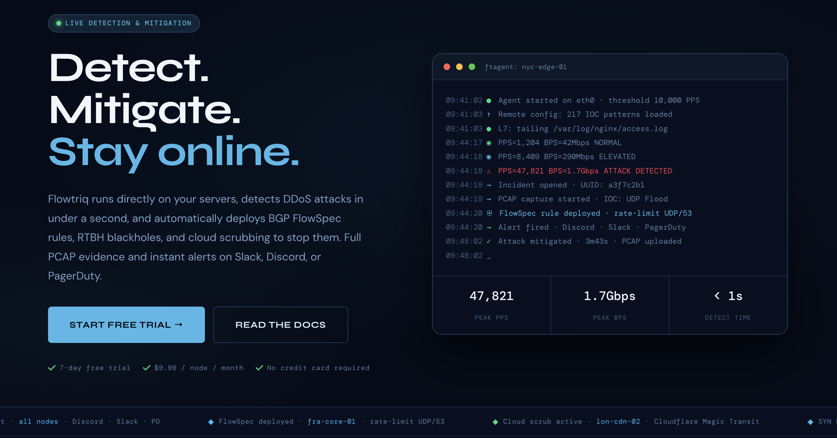 Flowtriq is agent-based and focused on sub-second detection plus automated BGP/RTBH escalation. Compared to Cloudflare Magic Transit or traditional scrubbing providers (Arbor, Radware, Corero), Flowtriq sits closer to your servers and gives you more surgical, node-level control — and a flat per-node price ($9.99/month). Use Flowtriq to detect and triage quickly, and escalate to global scrubbing only when needed.